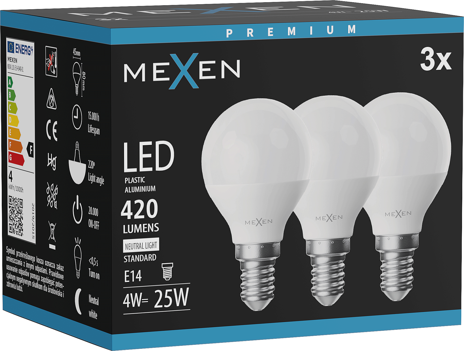Mexen Nova 3x Lampadina LED E14, G45, 4W, Neutro - 4000K, 420 lm - L101-E14-0440-01x03