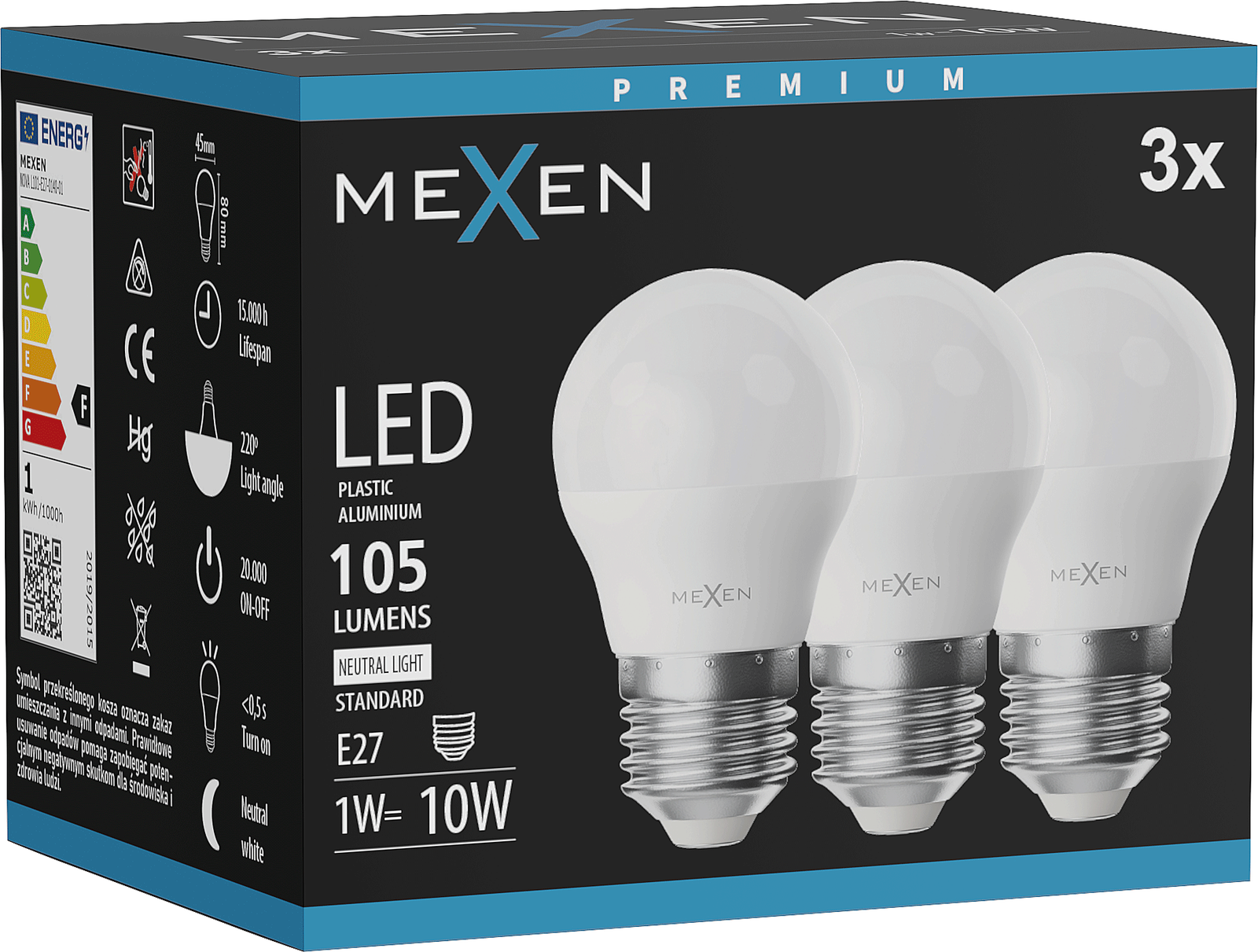 Mexen Nova 3x Lampadina LED E27, G45, 1W, Neutra - 4000K, 105 lm - L101-E27-0140-01x03