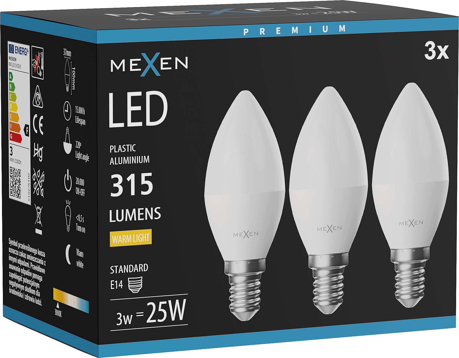 Mexen Nova 3x Lampadina LED E14, C37, 3W, Calda - 3000K, 315 lm - L102-E14-0330-01x03