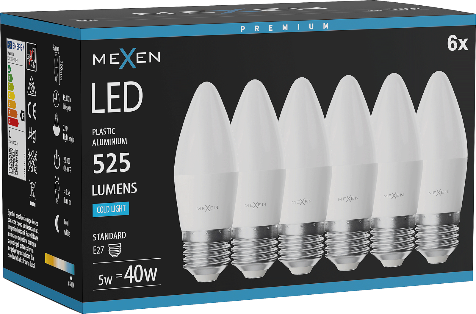 Mexen Nova 6x Lampadina LED E27, C37, 5W, Fredda - 6500K, 525 lm - L102-E27-0565-01x06