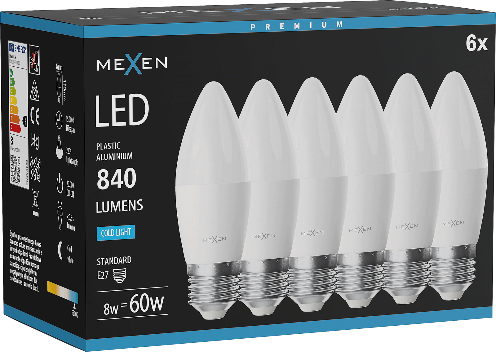 Mexen Nova 6x Lampadina LED E27, C37, 8W, Fredda - 6500K, 840 lm - L102-E27-0865-01x06
