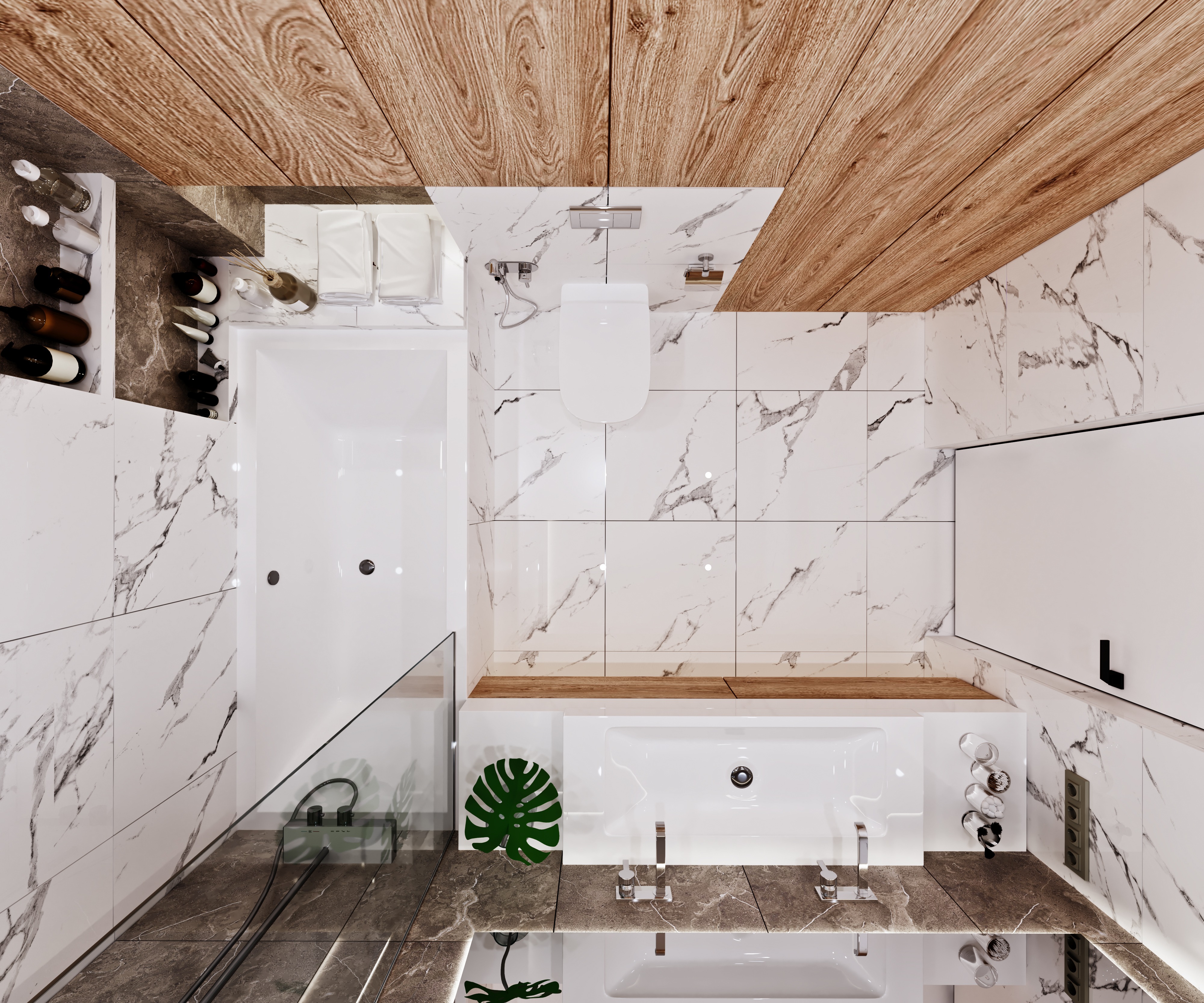Materiali naturali – tra le ultime tendenze, si nota la popolarità di materiali ispirati alla natura come legno, pietra o marmo. Queste disposizioni sono un ottimo modo per sentirsi a contatto con la natura. Si usano spesso pannelli in legno effetto legno, che conferiscono al bagno funzionale un tocco di calore e carattere naturale.