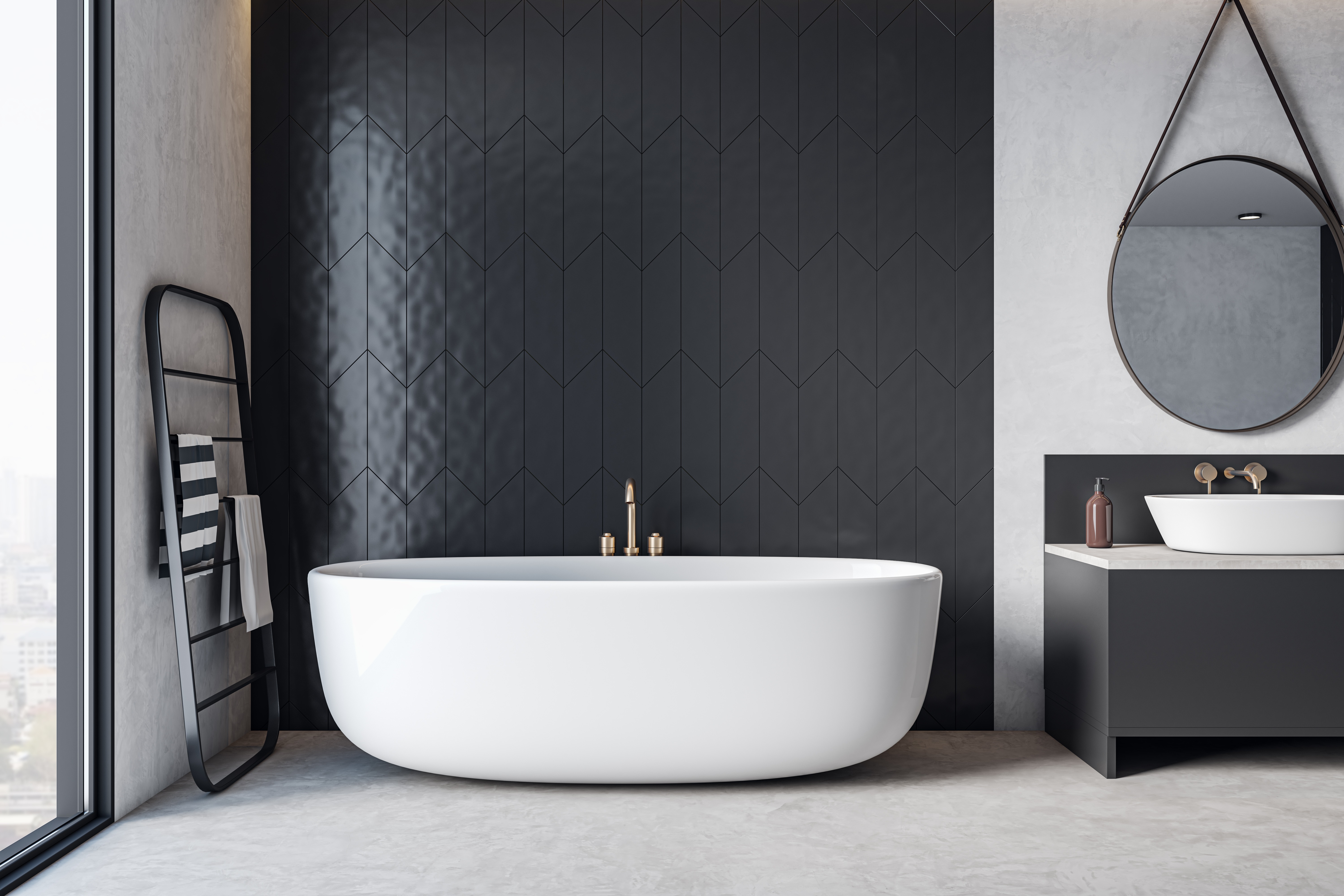 Nelle moderne stanze da bagno, il nero dell'arredo risulta molto attraente. Sono molto popolari sia i lavandini in conglomerato scuri che le vasche da bagno autoportanti nere. Tuttavia, queste superfici sono più difficili da mantenere pulite, poiché i depositi sono più facilmente visibili rispetto alla rubinetteria bianca.