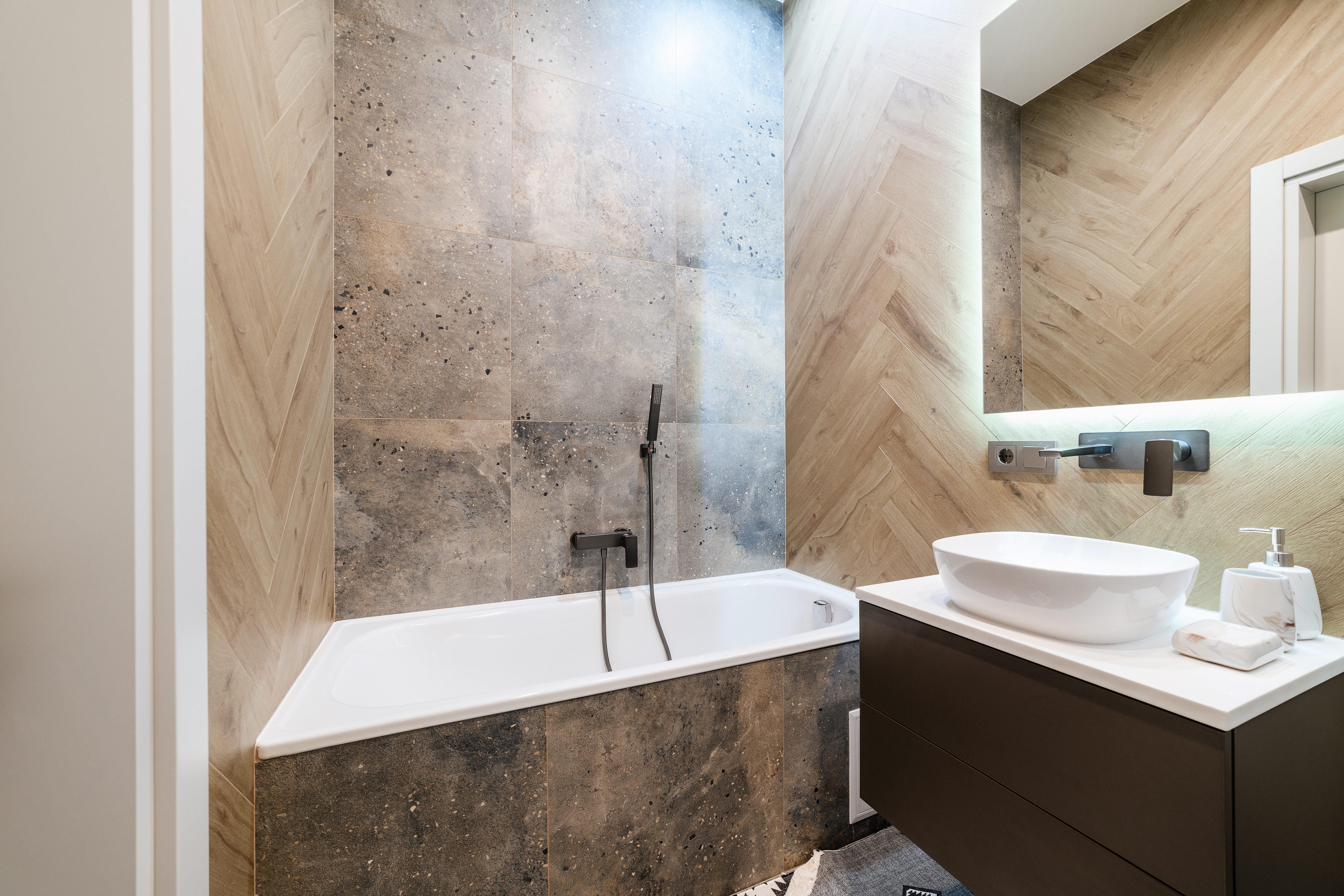 In un piccolo bagno si può usare un sistema vasca superficiale. Tuttavia, dovrebbe essere montato nel posto appropriato. Se è di piccole dimensioni e appare molto attraente, può aggiungere fascino all'intera stanza. Se il bagno è realizzato in colori chiari, cosa che è consigliata in piccoli spazi, il miscelatore della vasca può essere di colore scuro. In questo modo si contrasta splendidamente con le piastrelle e la vasca chiare, creando una certa profondità di colori. Un tale contrasto può anche aiutare a ingrandire la stanza visivamente.