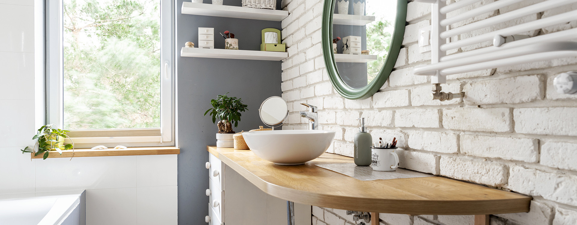 Un'altra forma per sottolineare il nostro bagno scandinavo è il mattone – grezzo o sbiancato. Questo elemento si può ottenere anche dalle imitazioni offerte dalle piastrelle ceramiche realizzate in questa forma.